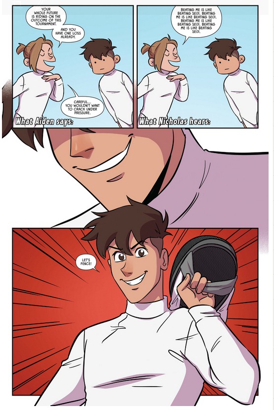正如教练评点,Nicolas某种意义上就是Aiden的克星:两耳不闻窗外事,一心扑在击剑上。头脑游戏激将法等等对他都不起作用,眼瞎耳聋沉浸在自己的梦想世界中(喂),状态不稳风格多变难搞定。结果理所当然,小可爱惊险胜出!